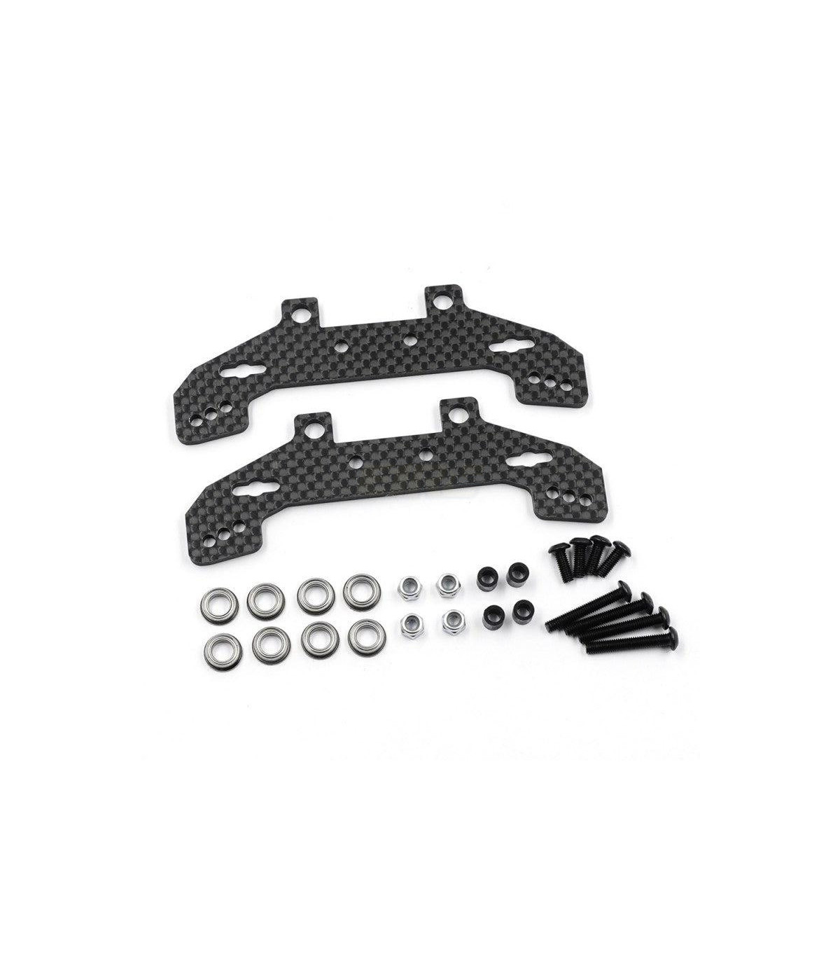 Dale a tu chasis Tamiya TT-02 una actualización performance con estos soportes de amortiguador de carbono por Yeah Racing. Fabricados en grafito de alta calidad, permiten montar amortiguadores de 65 mm para convertir tu TT-02 en una máquina de rallyconservando los puntos de montaje originales. Las fijaciones de los tirantes están sobre rodamientos para un movimiento más suave de la suspensión.