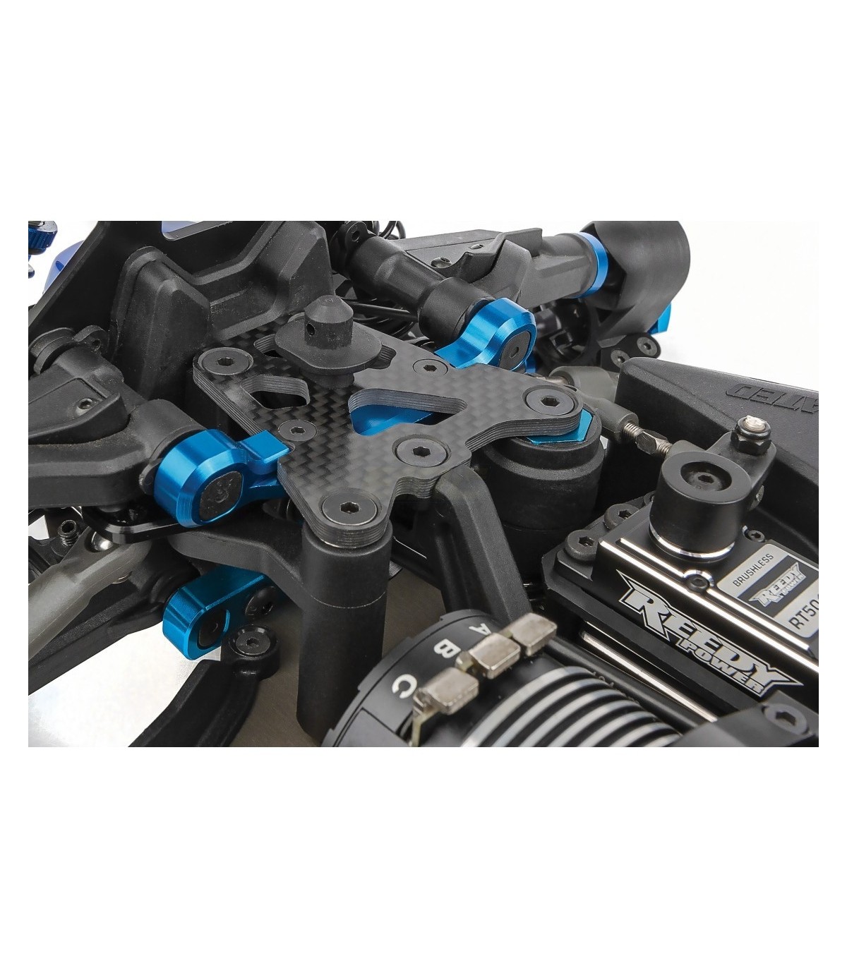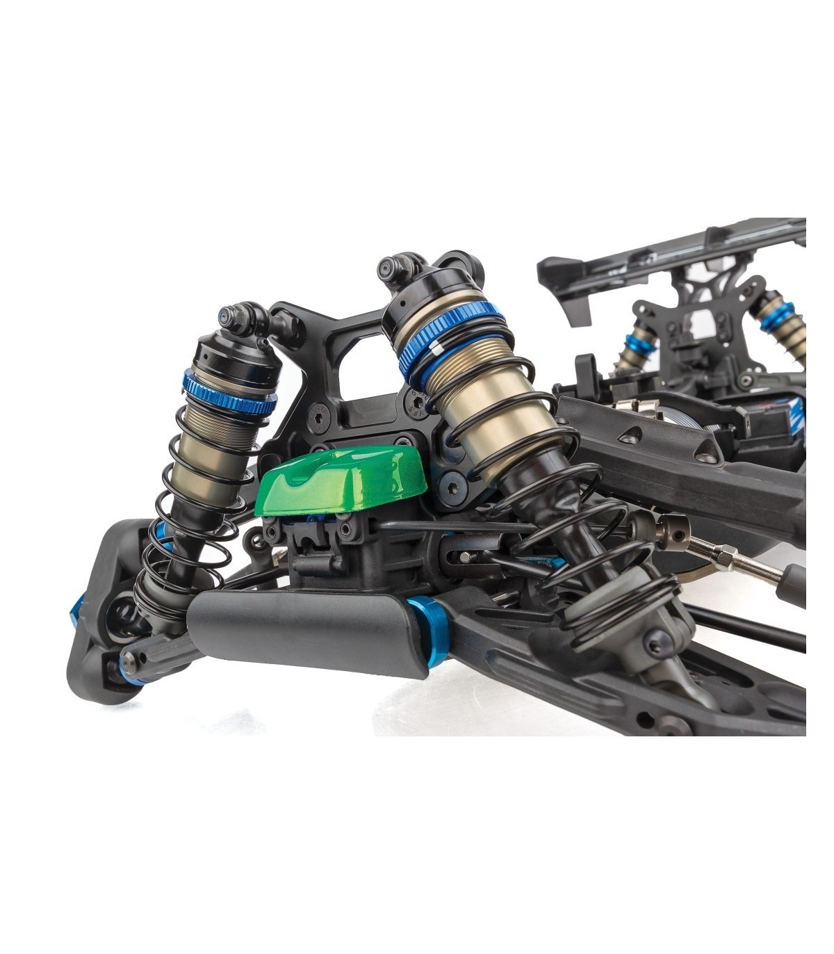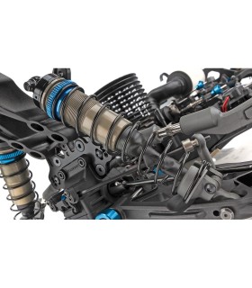 La suspensión se revisó con nuevas torres de choque delanteras y traseras de bajo CG y amortiguadores más cortos, junto con nuevos brazos de suspensión trasera de 3 orificios que permiten un choque y un resorte más suaves y al mismo tiempo mantienen el soporte en las curvas rápidas. Los nuevos bujes traseros de base ancha vienen en tres alturas de eje fijas y utilizan torres de buje de fibra de carbono de 3 mm para permitir varias opciones de geometría diferentes.