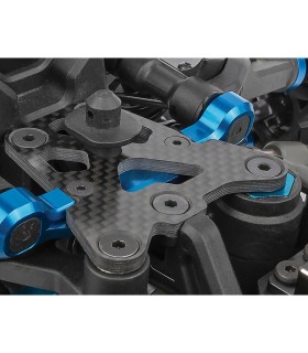 La placa superior frontal de fibra de carbono RC8B4e centraliza el soporte del chasis delantero para una flexión equilibrada en todas las direcciones.