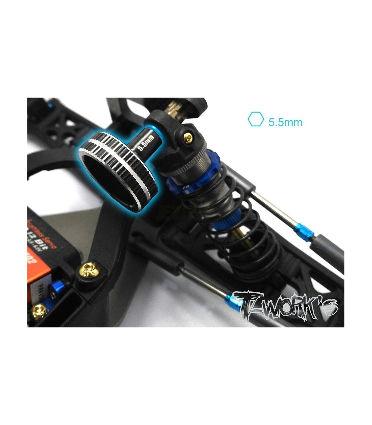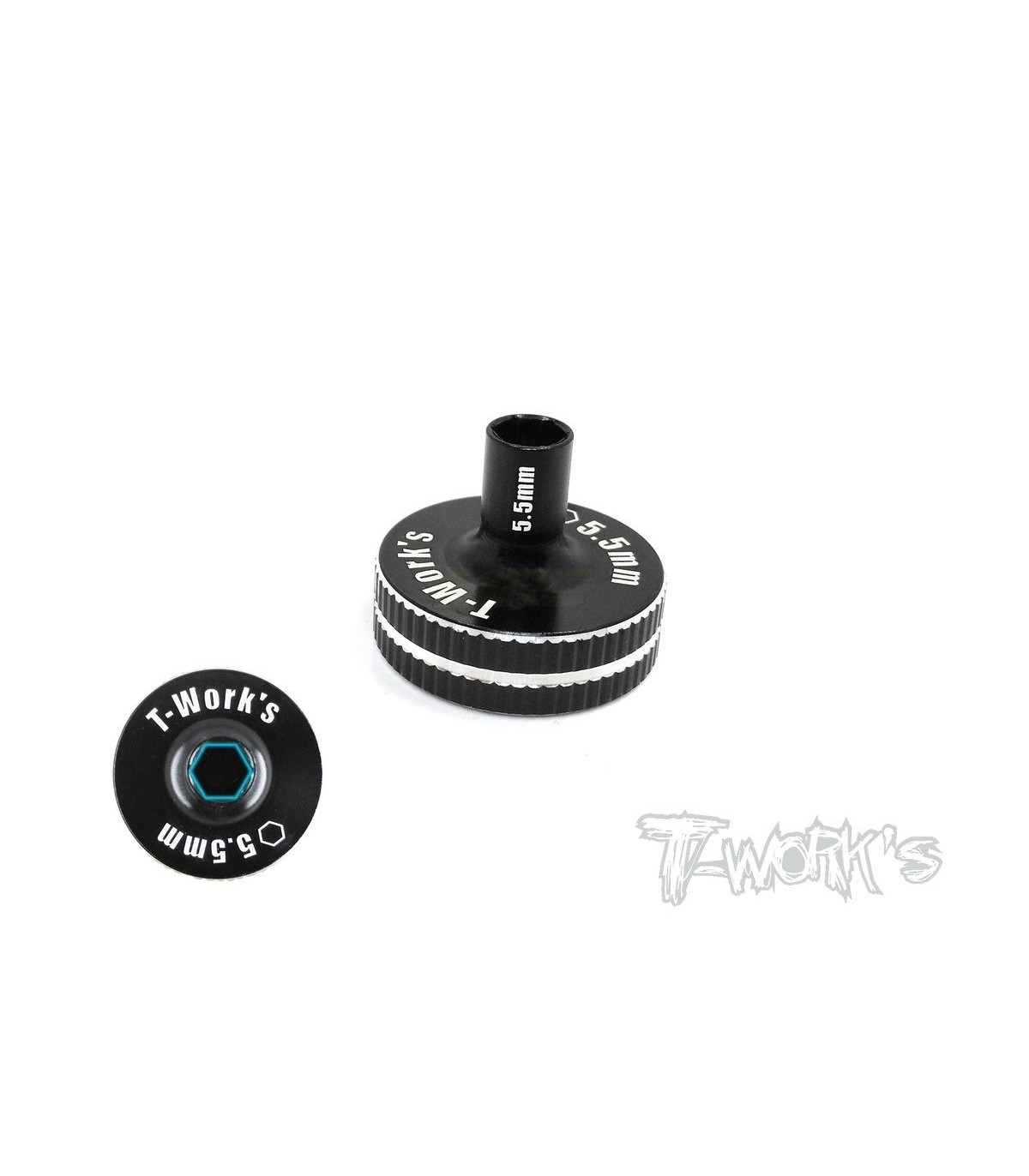 Short 5.5mm nut driver. The tool is machined from aluminum, comes in black anodized finish for durability and aesthetics, and is particularly useful for 1/10th 2WD buggies where accessing the front suspension's shock mount nuts can be challenging. Thanks to its large diameter, even tightly secured nuts can be easily loosened.