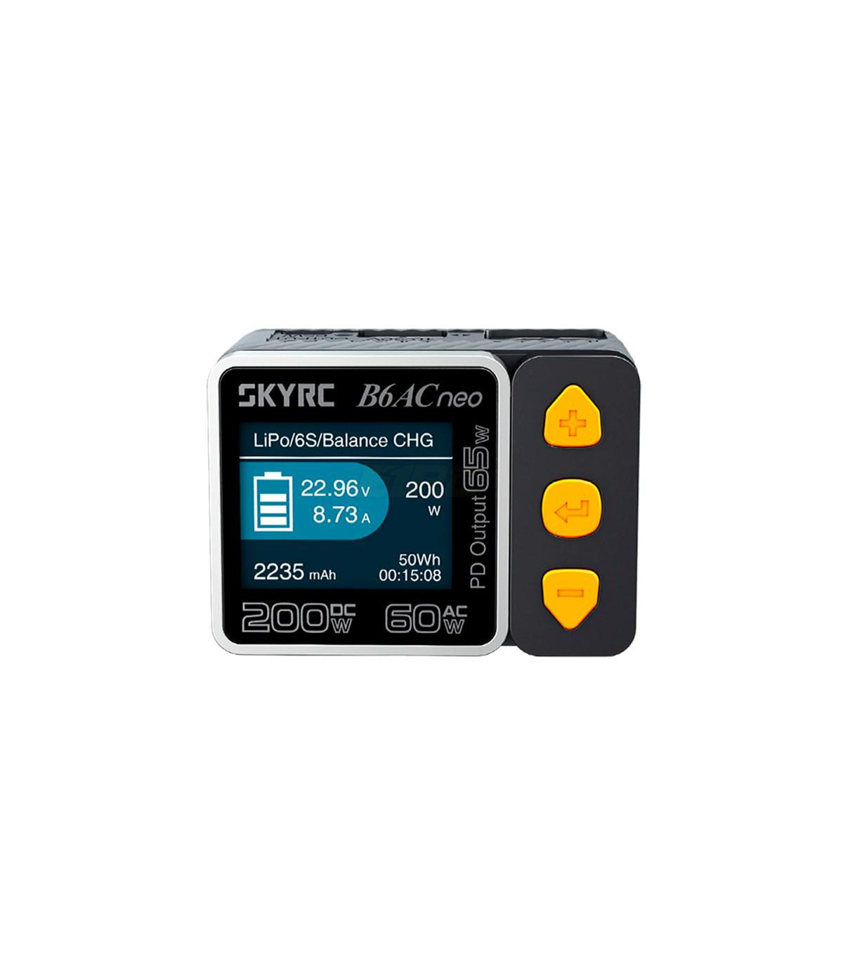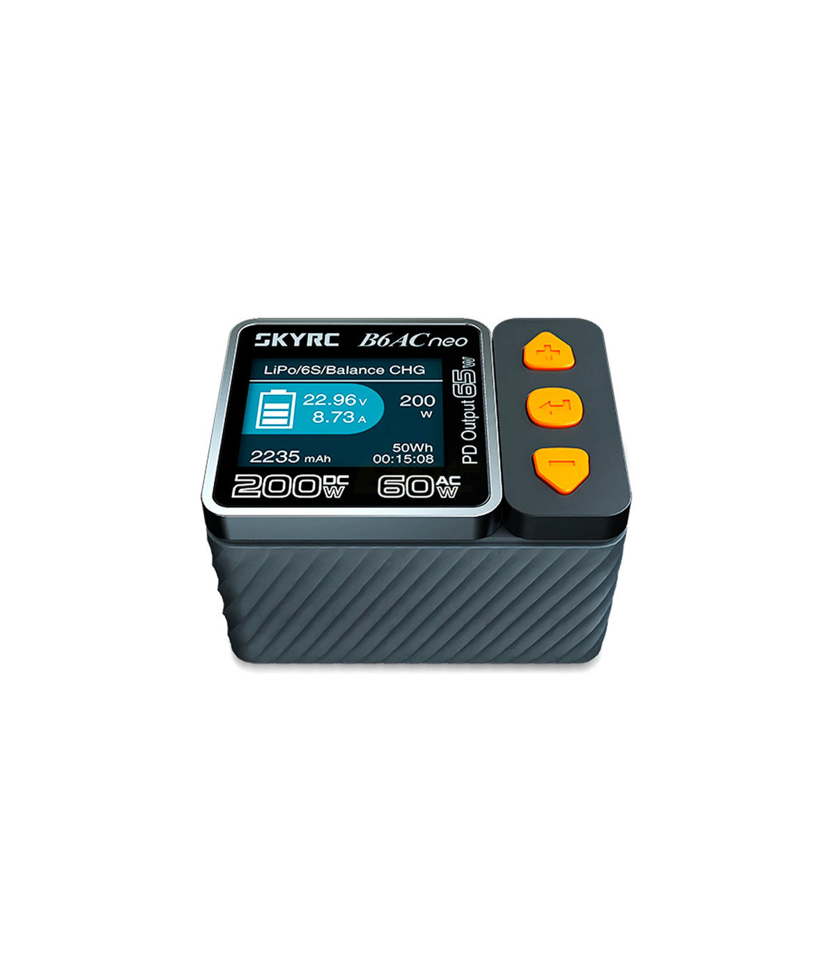 Una belleza por fuera y una verdadera bestia por dentro: así es el B6AC neo. Un cargador verdaderamente compacto pero extremadamente potente que conserva las funciones básicas del B6AC V2 original. Esta pequeña carcasa contiene una impresionante potencia de carga de hasta 200 W DC o 60 W AC y gracias a los distintos puertos como XT60 y USB Type-C, este cargador se puede utilizar casi universalmente.