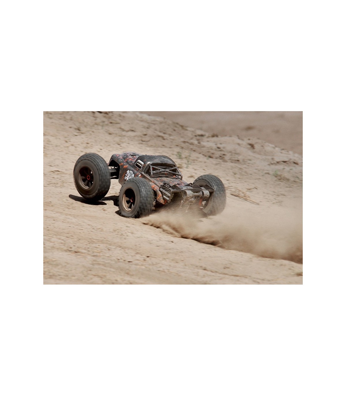 This truck is the ultimate stunt basher for those seeking awesome speeds, massive wheelies, and huge jumps, featuring a super-durable, all-metal four-wheel drivetrain, fully independent suspension, short wheelbase racing chassis, and aerodynamic racing design.