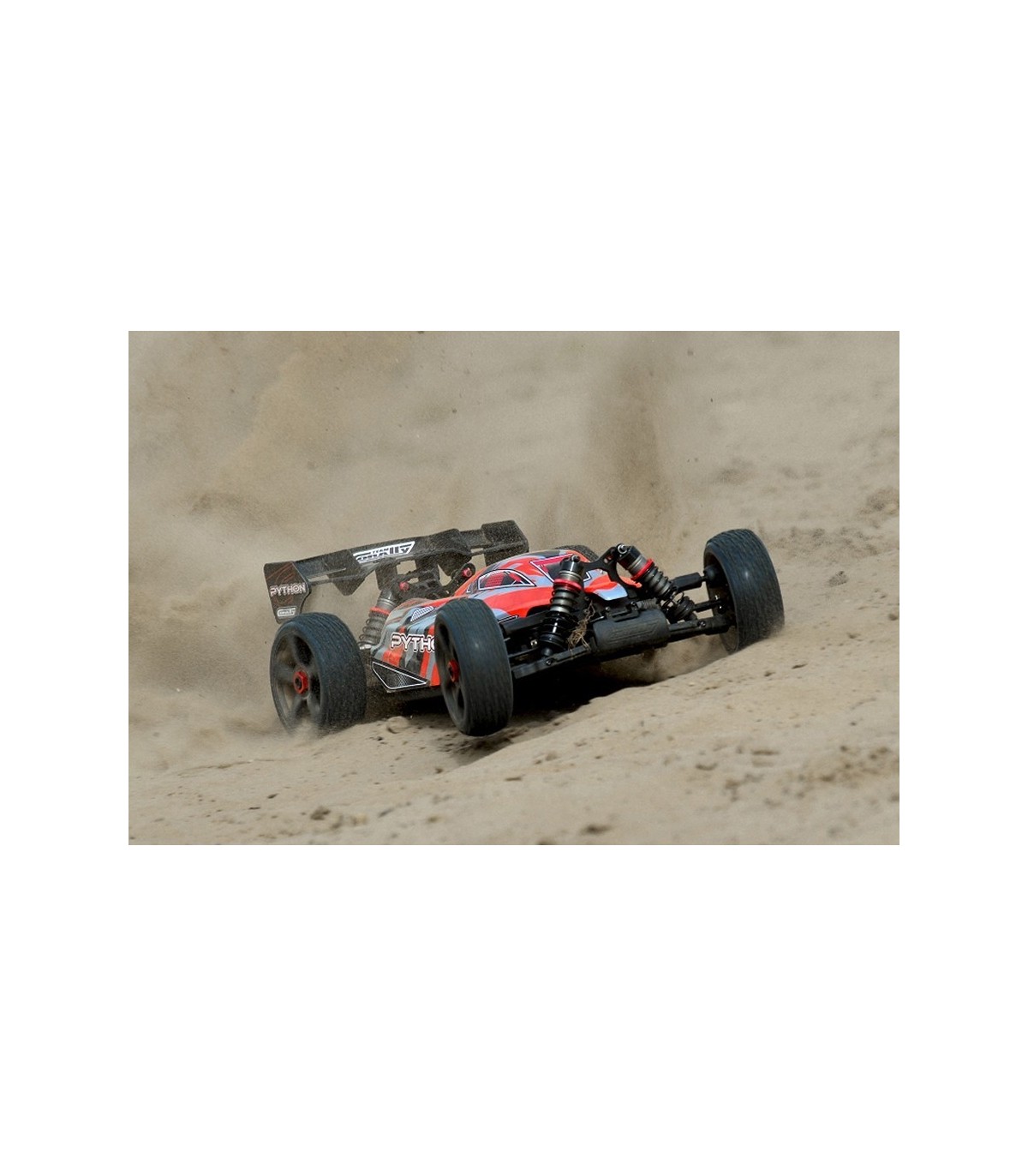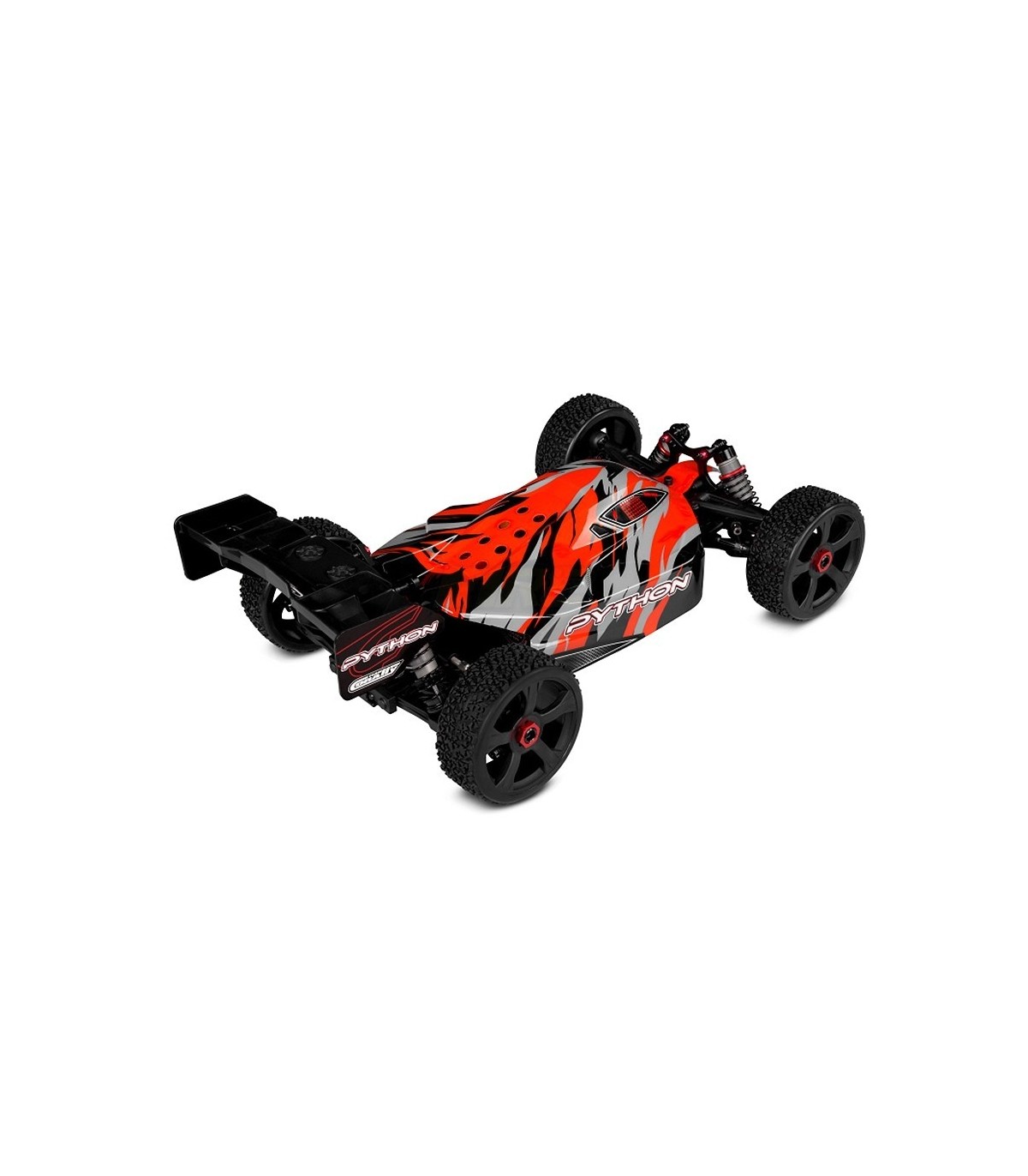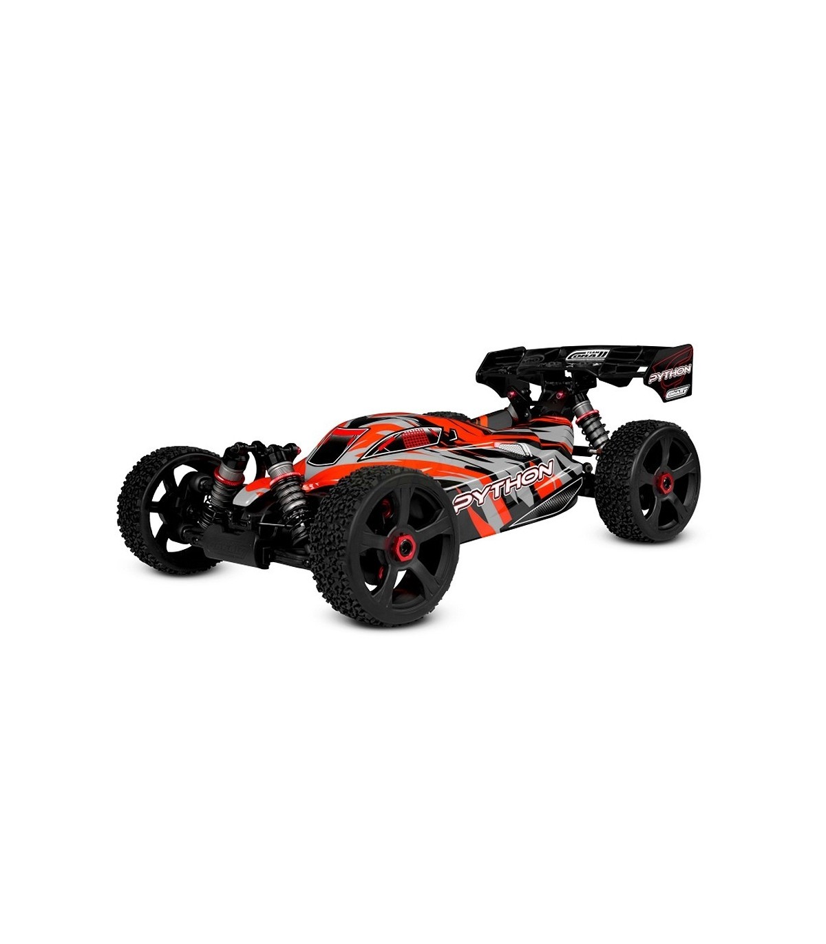 Just like the top competition racing buggies and trucks on the market today, the Python features extra-strong pivot ball style front suspension featuring steel pivot balls and steering turnbuckles as well as super-durable composite suspension arms. The rear suspension features upright hubs and steel camber link turnbuckles. At all four corners, extra-thick suspension arms made from HiCC8 composite and threaded 16mm big bore oil-filled shock absorbers make sure that the tyres stay in contact with the ground for maximum forward traction - unless you're flying through the air, of course!
