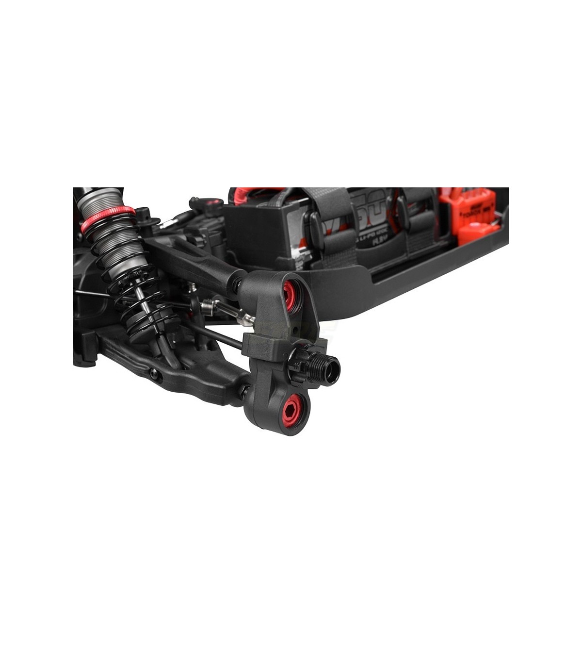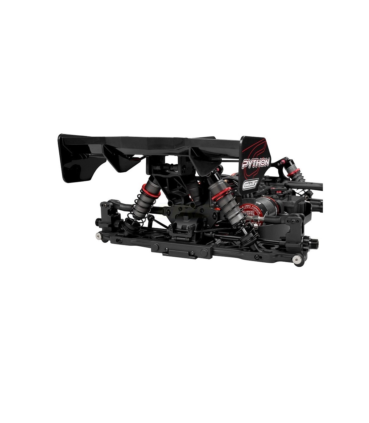 Taking cues from the top professional racing machines in the RC industry, the Python uses a flat pan-style chassis for the most efficient chassis layout possible. With a forward weight distribution, the weight of the drivetrain and all the components are kept as close to the front as possible. Substantial braces front and rear provide extra stiffness to allow the aluminum big bore shocks and HiCC8 composite suspension parts to do what they're meant to do. The reinforced chassis side guards have integrated front brackets that protect the body. The Team Corally SPL System locks the spring perches and prevent from losing the perches during hardest shock action, while the front and rear mounted Team Corally RSP Sway Bar System keeps the Kronos planted in corners and ensures a consistent handling in all conditions.