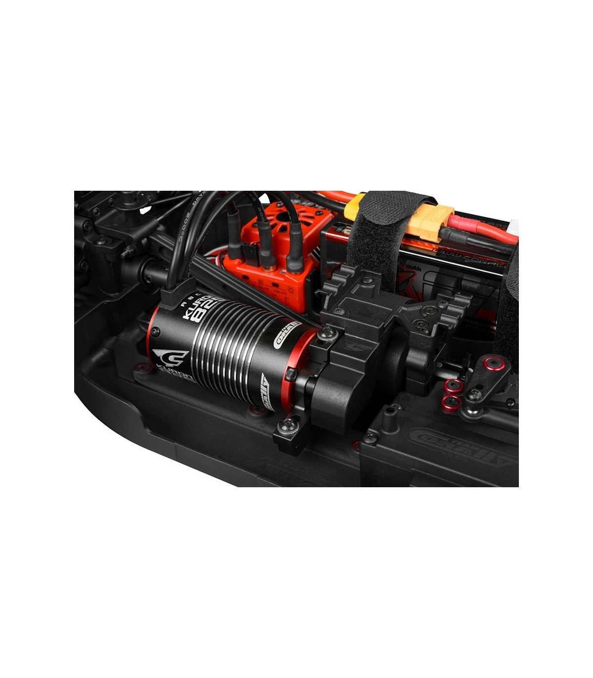 With the Team Corally Kuron 2050KV 4-pole motor mounted on the extremely torsion-resistant 2-piece sliding motor mount, you can be sure to get the maximum speeds out of the Box for supreme, big-air stunts and massive top speeds! The motor is fitted with a hardened steel pinion gear, which spins a hardened steel spur gear attached to the centre gear differential. You want huge speeds? You can get them with the pull of a trigger! Speeds of over 110 km/h (70+ mph) are easy - just fit big enough batteries!