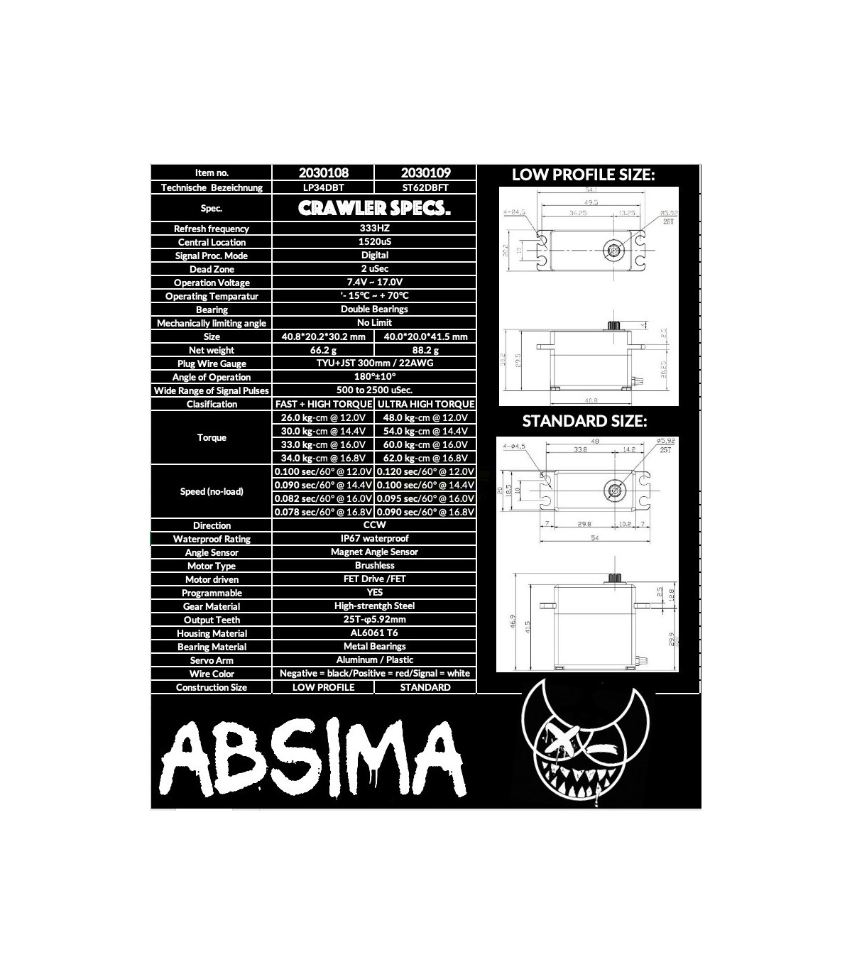 Nuestros servos "Crawler Spec." se utilizan principalmente en vehículos todoterreno a escala 1:8 y 1:10, así como en otros vehículos pesados ??que requieren mucha potencia en el eje de dirección.