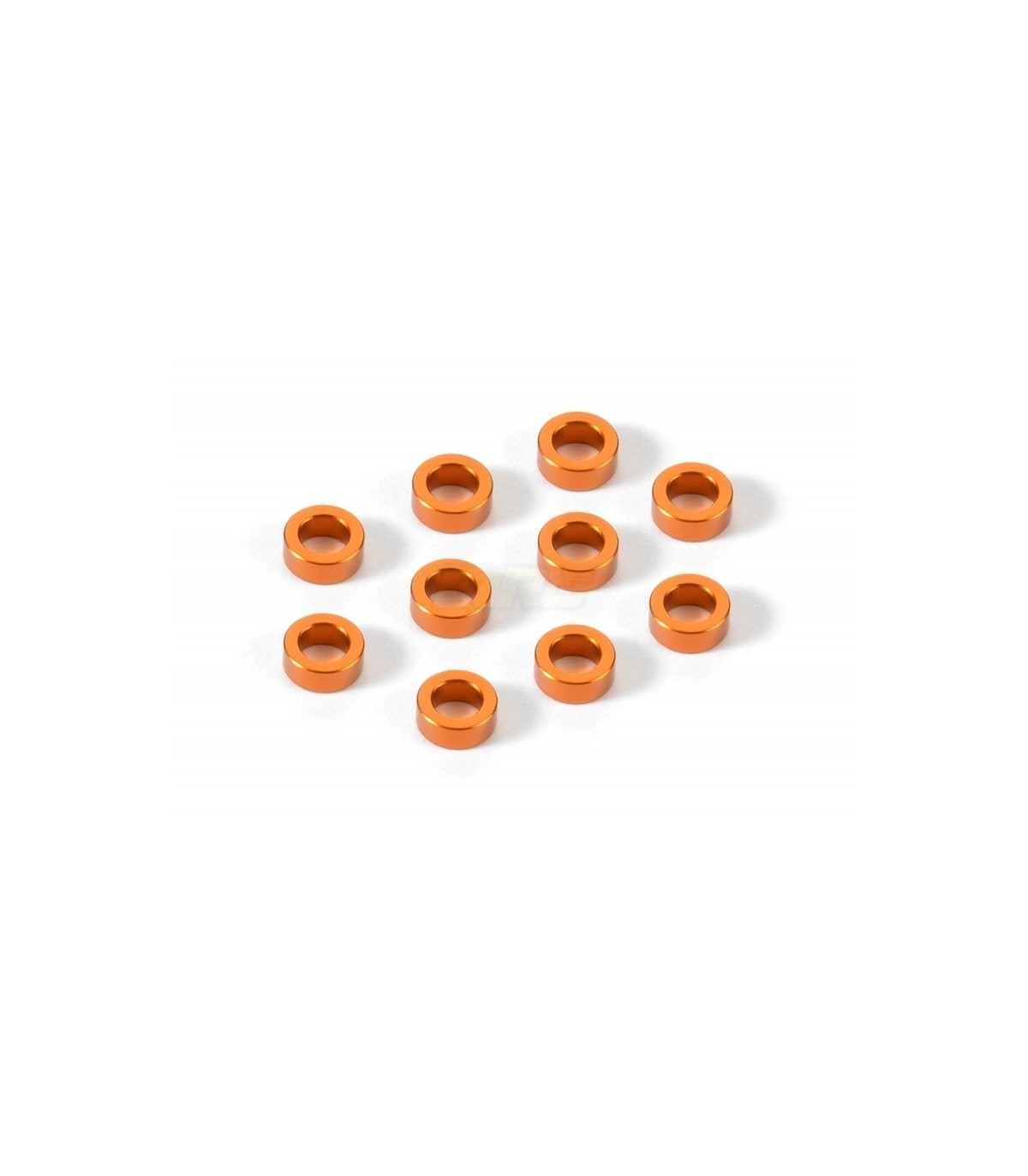 The Orange Aluminum Washers 3x5x2.0mm from Xray are essential components for precise adjustment in 1/10 On-Road and Off-Road RC cars. This pack of 10 units ensures a perfect assembly on 3mm shafts with 5mm bearings, allowing you to optimize the mechanical response of your chassis in competition.