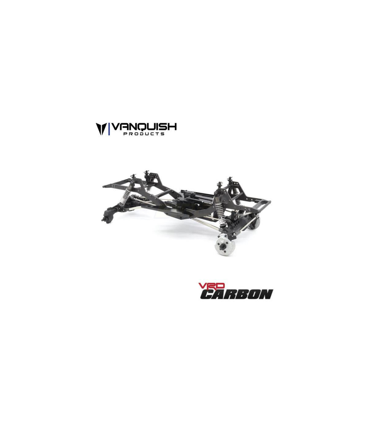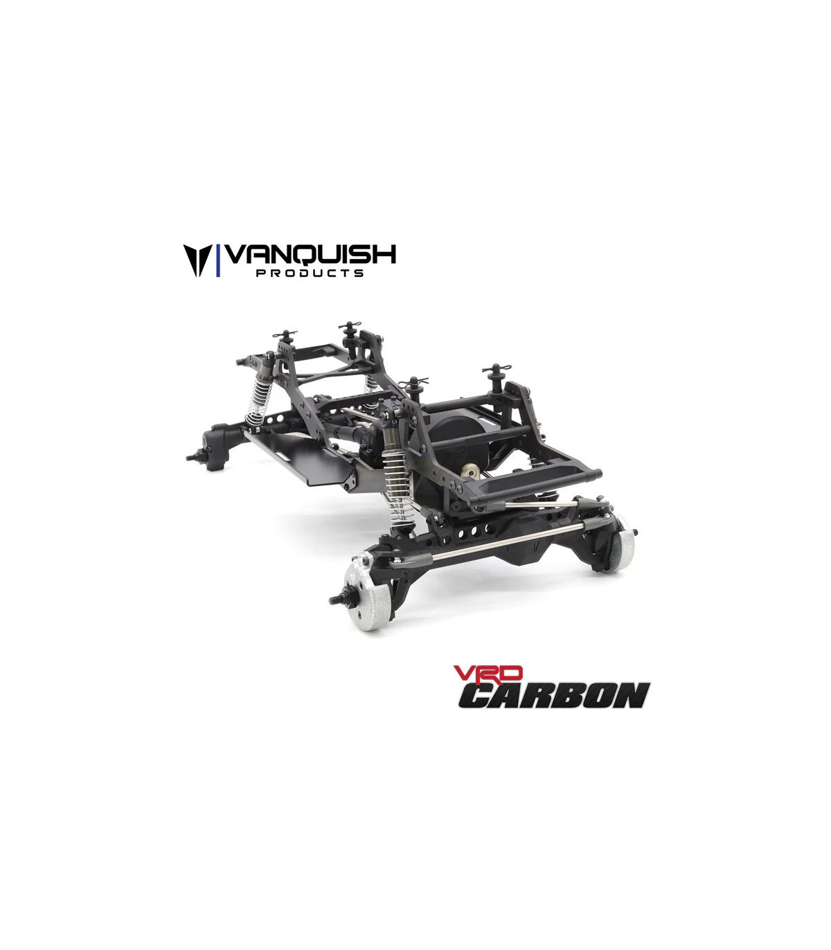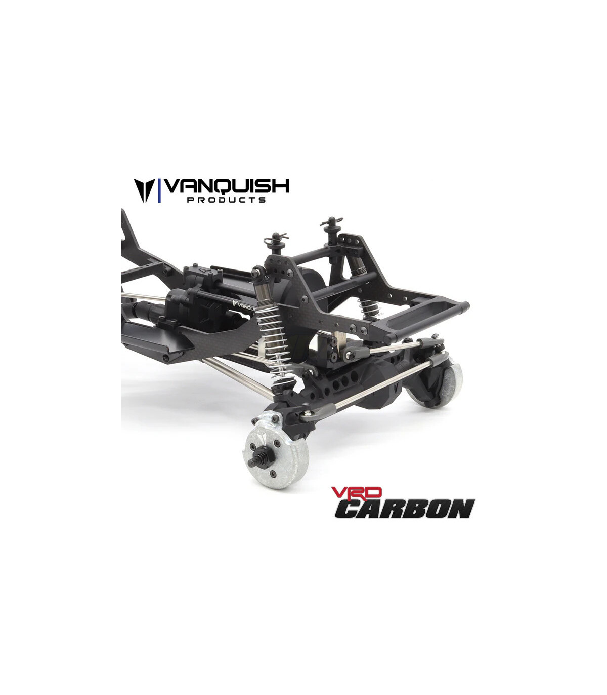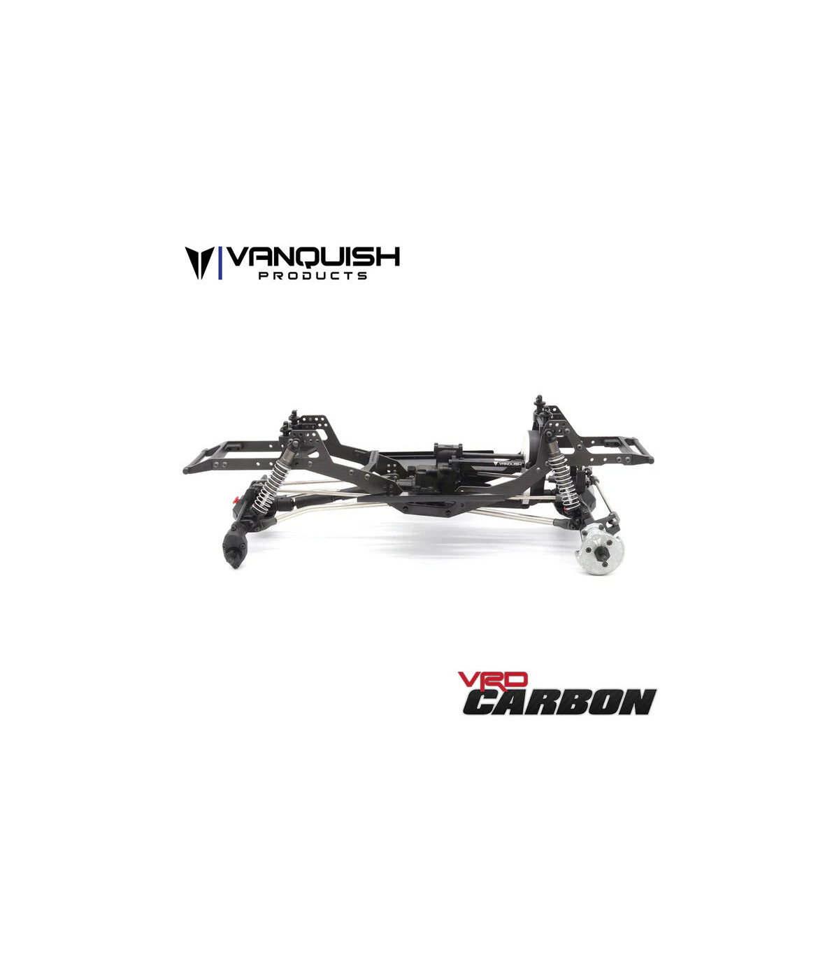 The VRD carbon chassis from Vanquish Products features completely redesigned chassis components, providing a tunable platform for adapting to the most demanding terrain. Multiple shock and body mounting positions, combined with minimalist, interchangeable front and rear bumpers, make body mounting and customization a breeze. Stamped aluminum rock sliders offer a flat mounting surface for electronics and/or battery, while also supporting and protecting your bodywork.